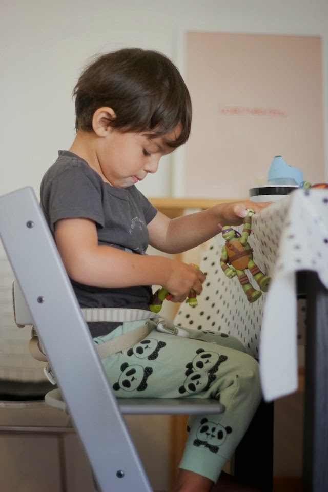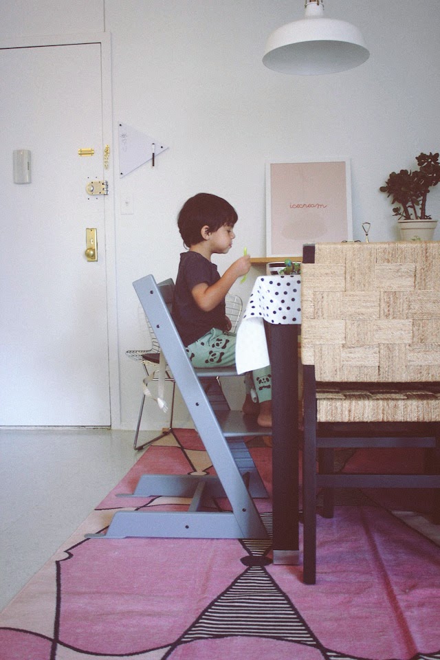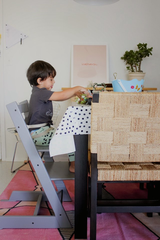 In our old apartment we mostly ate around a small parsons table (or the couch if I’m being totally honest). We lived in such tight quarters that a formal dining room was not an option. I really missed serving dinner and sitting around the table as a family – talking, laughing, and sharing stories about our day. When we moved one of the things I was most excited for was our new dining room (still a decorating work in progress ;). I had seen the Stokke Tripp Trapp in the homes of many of our friends but never knew what the fuss about. Until now. I seriously don’t know how we lived without this incredible highchair. When it first arrived I wasn’t sure how Lucas would like it as he has been using a more traditional highchair for so long. I kid you not he climbed right on with the biggest smile and proclaimed “it’s dinner time!”. There are so many things I love about the Tripp Trapp and I could go on and on but here are a few of my favorite features: The structure and height. It’s incredibly easy for Lucas to climb on and off and it gives him the feeling of independence which is so important at this age. He also loves to strap himself in and the harness is extremely comfortable and non-restricting. The footplate. Lucas’s legs are growing like weeds and the footplate makes a huge difference in his comfort (no more dangling limbs!). The gorgeous color. Storm Grey. It’s the perfect color and works in any home aesthetic. This shade launched just this week (!!) and is the newest color in the Tripp Trapp family. It grows with your child. The Tripp Trapp can be used from birth to adulthood. Ivan and I both tested it out and we definitely fit comfortably in the chair. A huge thank you to Stokke for sending Lucas the raddest highchair ever!