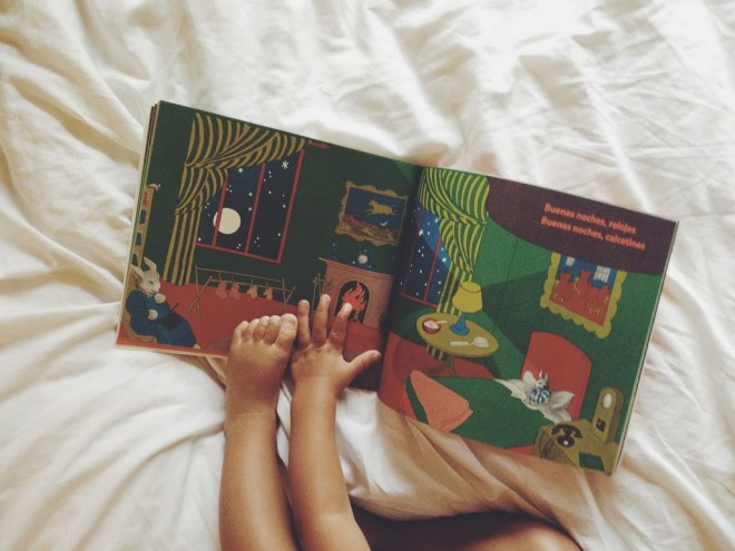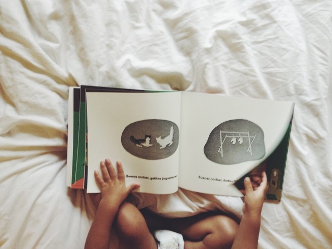 I absolutely love reading with Lucas. For a long time Lucas didn’t share my enthusiasm. He was much more interested in slamming books shut and chucking them as far as he could. Sometimes the dog would catch a swift blow to the head (sorry Humphrey!). As he is getting older, I find that he enjoys sitting with me and reading for longer periods of time. He of course loves book options that make noise, because well, donkey and pig sounds are pretty rad. One of my favorite books to read with Lucas is Buenas Noches, Luna – the spanish version of the classic Goodnight Moon.