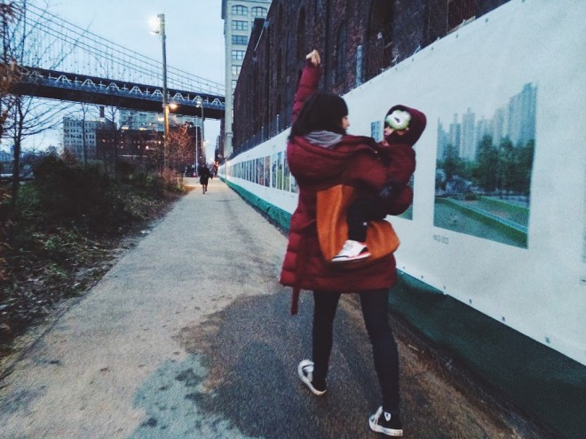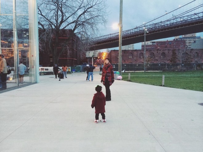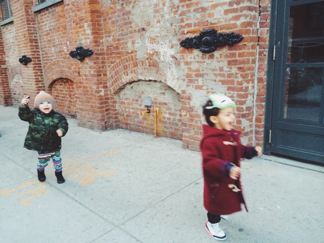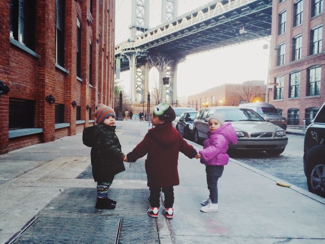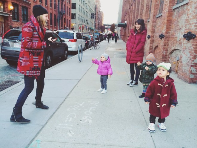 Saturday was perfect. It was cold, but not too cold. The sun was shining. Brooklyn was calling our name! We headed down to Dumbo to see this babe and this babe (plus the little ones of course). Christine recently moved into a new apartment and it’s pretty – ok, REALLY – amazing. Definitely inspired me for hopefully soon upcoming move. We ran around Dumbo with pretty much the best trio there ever was. These kids are destined to be city bff’s. A ride on the carrousel and a pit stop for cupcakes and wine later, we headed back to the house to eat chinese and watch football with the hubby’s. The night ended with fresh and so clean tots and cocktails for the parentals. I heart these ladies and those sweet babes of theirs. tee c/o slyfox threads | windbreaker & sweats c/o nununubaby | mask from littlest crochet shop