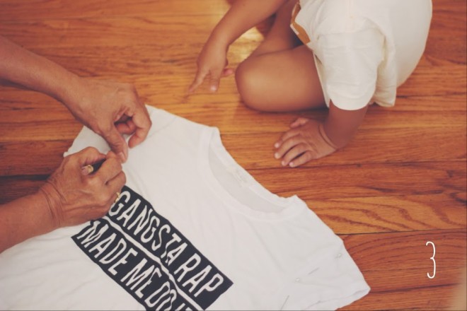 Use a pencil to mark where you’d like to cut. I wanted a slouchy fit so my mom made the markings about 2/3 away from the collar. You can use one of your toddlers tanks as a guideline if you want a more standard look for the sleeves. Either way, create your markings with a little more space – you can always cut more or sew the sleeves more to your liking. It’s better to give yourself a little room to play with. Once you cut, you can’t go back!