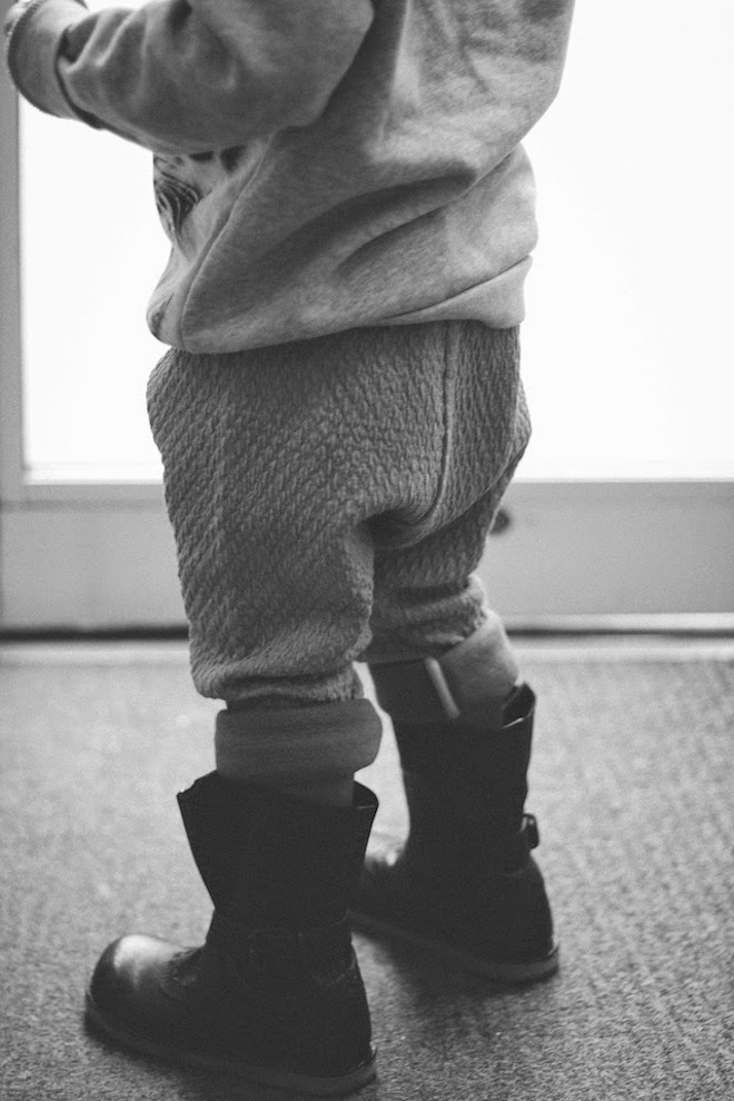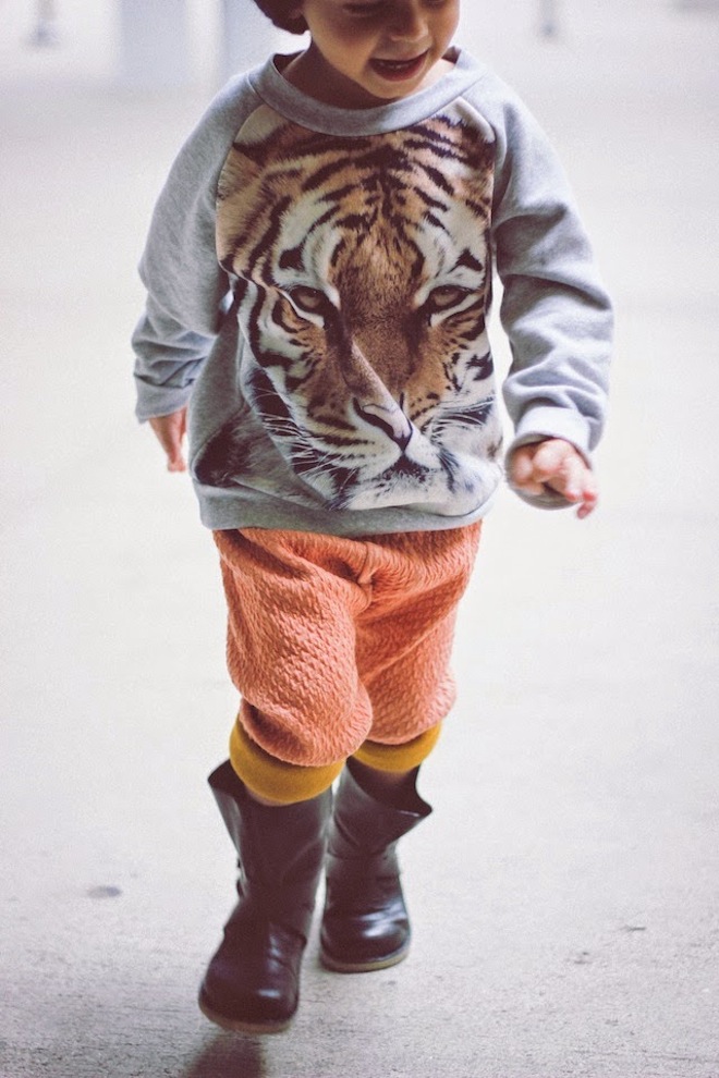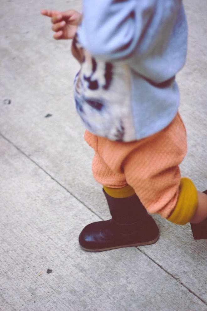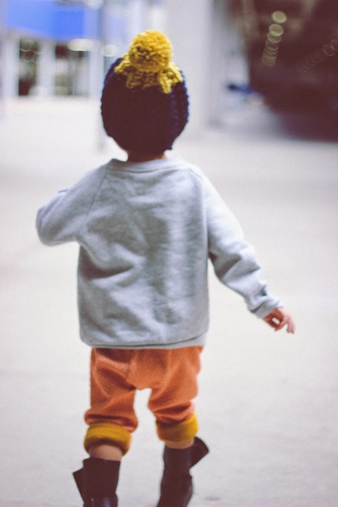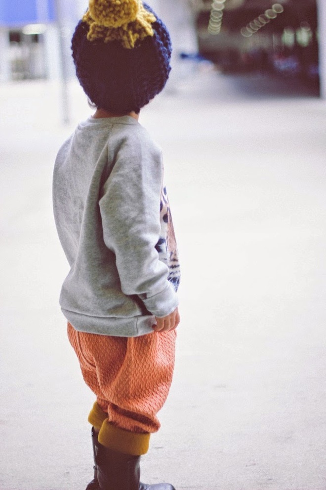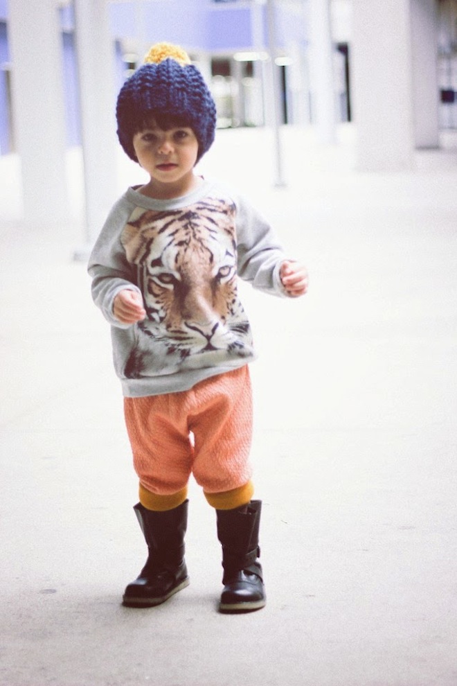 That’s right. Real boys rock peach. I am so in love with these Macarons pants from Carousel NY. Cuffed twice, the mustard lining adds the perfect Autumn touch. Also perfect? This knit beanie from Lulu Luvs (made in Brooklyn!) and a Popupshop Tiger sweater from Milk Bots.