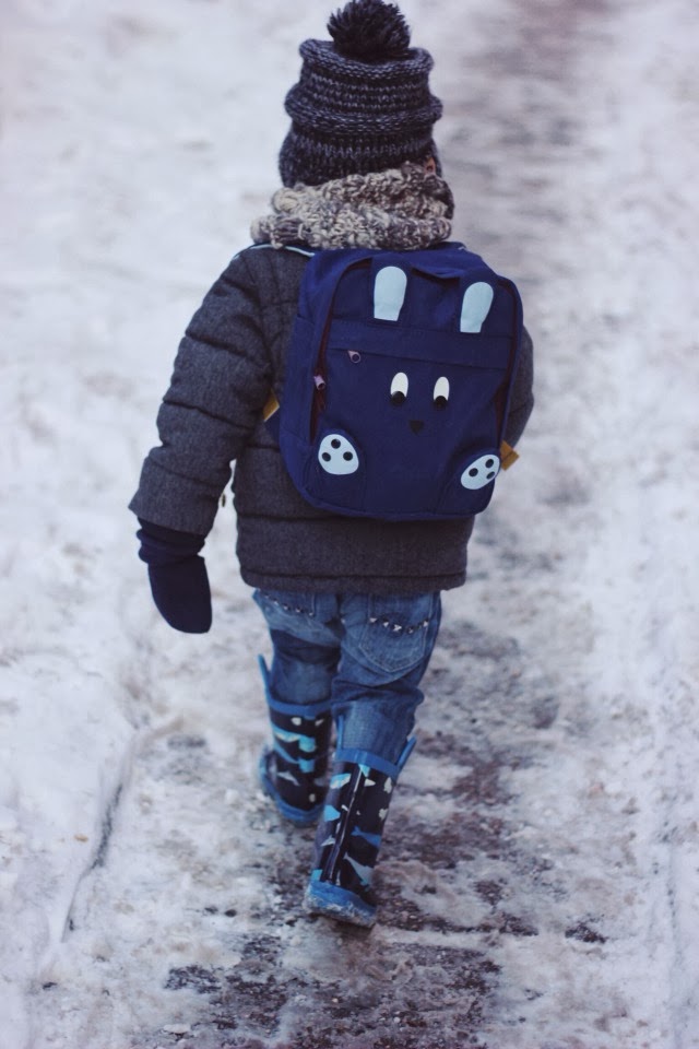So this morning we arrived at 8:50am. I switched him out of his wet snow boots, put on his sneakers, and headed to his new cubby. As I was hanging up his coat he ran into his classroom and didn’t look back for me. My heart sank. I followed him in and actually yelled “Lucas! BYE!” He looked back and gave me a weak “bye”. Crushed. I was crushed. I left to drown my sorrows at a nearby Starbucks and returned at 11:30, 1/2 hour before pickup, and planted myself in front of the observation window. He was eating lunch family style with his classmates. He looked so darn happy you would have thought he was having brunch in Disney World. He was SO happy. He was beaming. I felt a sense of relief wash over me.