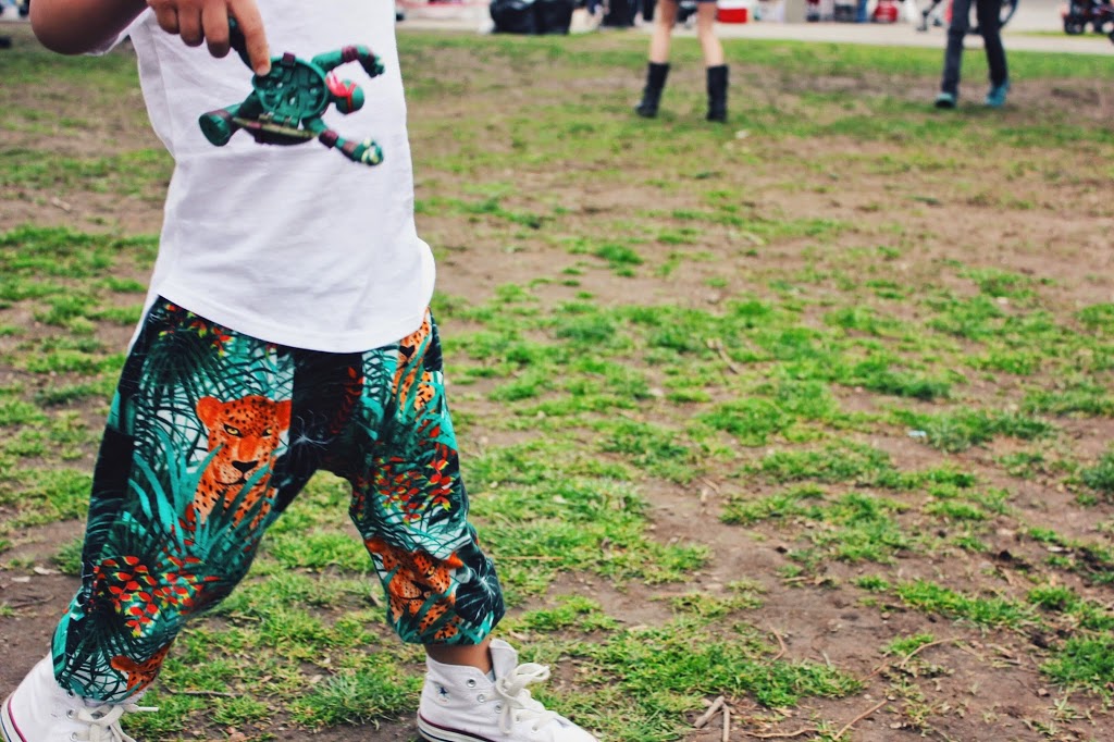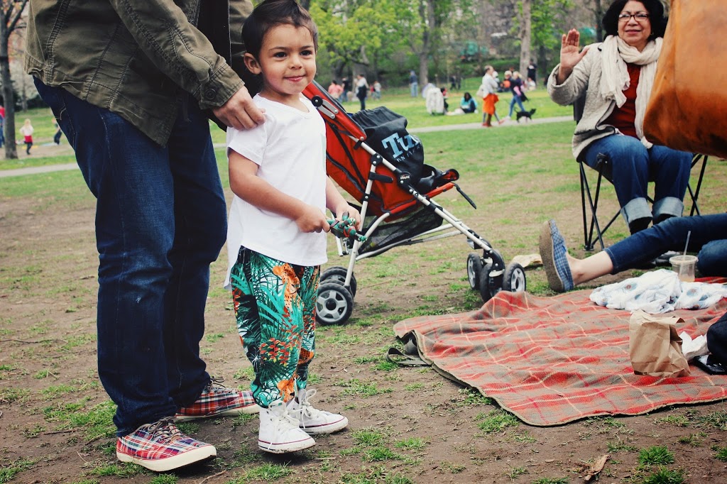 I love our weekend trips to Brooklyn. My sister in law is lucky enough to live a stones throw from Prospect Park which makes for fun, family picnics and easy access to a bathroom 😉 Lucas usually naps around 12pm and since we were on the train headed to the park during that time he decided to skip his usual snooze time (trains rides are just way too exciting!). As we approached the park he slowly started to turn into a MESS – skipping nap time will do that to you. So he slept for the first 2 hours and woke up with the dancing bug. FYI – yes, I’m a lucky mama. My kid can sleep through anything. Including a magic act and hip hop music blasting throughout the park. So fast forward 2 hours later and the kid was ready to party. I may be biased but Lucas is an incredible dancer. Seriously guys, the boy has moves! The moment my boy turns 3 (EEK!) he will be enrolled in dance. Dancing was such a big part of my life as a child and I think it’s such an incredible way to learn to express yourself. Plus music and dance is just in his blood. It’s pretty clear to see. So any who, dance class in a few months, amazing park trips to look forward to this summer, and the dopest dancing pants you ever did see.                                     tee c/o no sweet | pants from munster kids c/o carousel ny | sneakers from converse